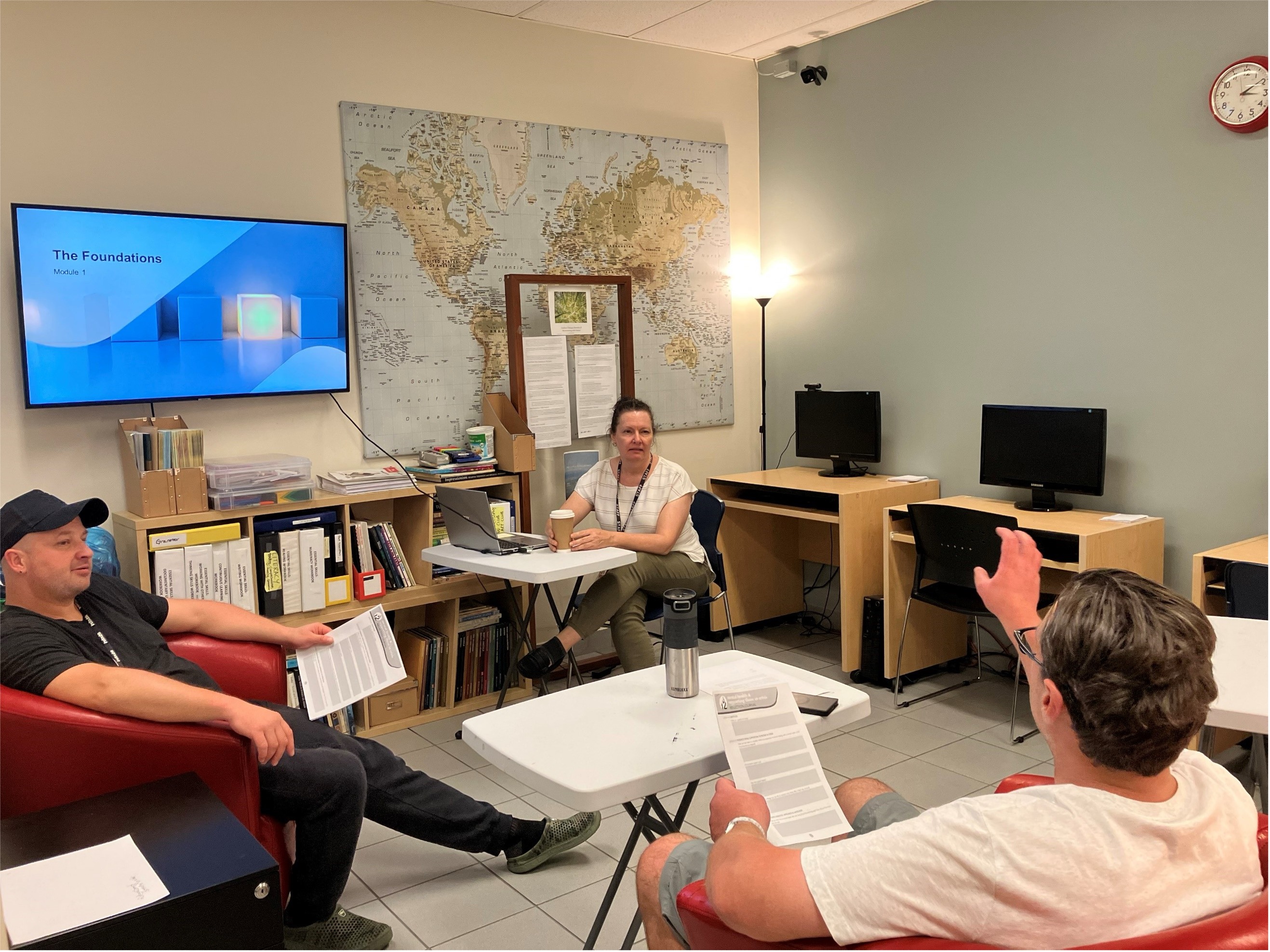 Within this learning stream, we empower participants to enhance their employability through a combination of group and one-to-one coaching sessions. Computer skills are taught progressively, ensuring that participants gain proficiency in essential tasks such as creating an email address, developing a resume, and utilizing search tools for job hunting. Alongside computer literacy, the Learning Centre engages participants in life skills training that covers a wide range of practical competencies, including resume writing, budgeting, mindfulness, and stress management. To further support work readiness, we offer training in common certifications such as FoodSafe, Workplace Hazardous Materials Information System (WHMIS), and Occupational First Aid. These certifications can significantly improve earning potential, particularly within the local hospitality and construction industries.